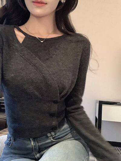 Sweet Solid Color Front Button Cropped Camisole Long Sleeve Spring