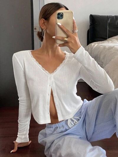 Damski kardigan z długim rękawem i dekoltem w serek, koronkowy panel z przodu, dopasowany, jesienne ubrania damskie-46%