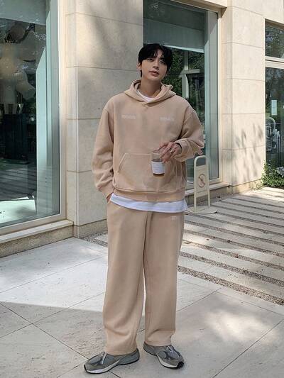Męski komplet z kapturem i podszewką termiczną, z nadrukiem w litery, brązowy, jesień/zima-60%