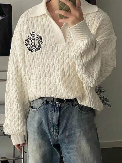 Męski swobodny sweter z opadającymi ramionami i wzorem liter w kolorze beżowym, jesienna szkoła-38%