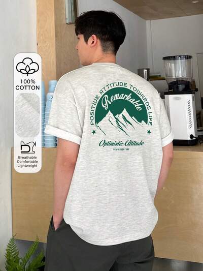 Męska letnia koszulka z krótkim rękawem i okrągłym dekoltem z nadrukowanym hasłem górskim-33%