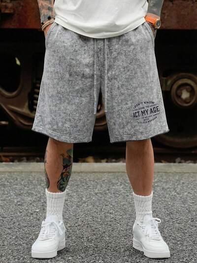 Męskie szorty z nadrukiem w litery, sprane, szare, z elastyczną talią, letnie10,25 USD21,99 USD