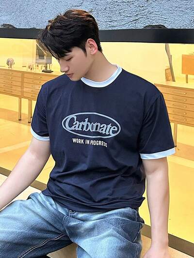 Wiosenna męska koszulka z okrągłym dekoltem i nadrukiem w jednolitym kolorze i literami-34%