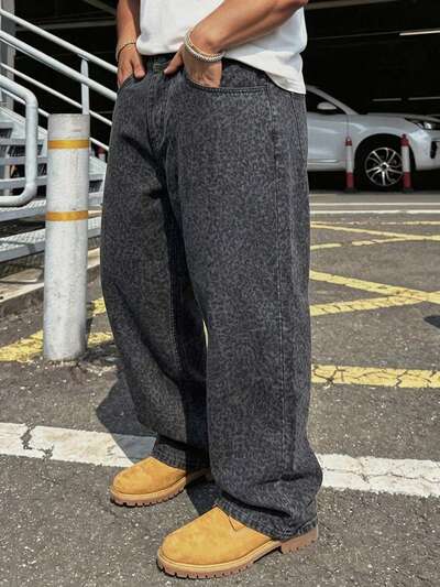 Męskie jeansy w dużych rozmiarach, luźne, proste, ciemnobrązowe, z nadrukiem w panterkę, odpowiednie na wiosnę i jesień
