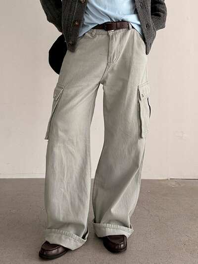 Męskie jeansy typu cargo w jednolitym kolorze z kieszeniami, sprane i zniszczone, wiosna/jesień-45%