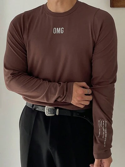 Męska koszulka z długim rękawem i okrągłym dekoltem z nadrukiem liter, letnia, z nadrukowanymi koszulkami-26%