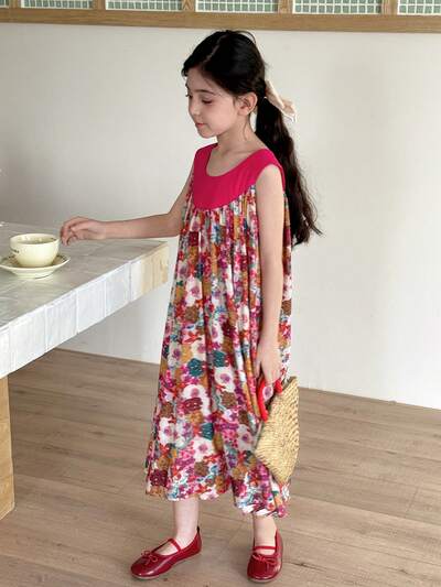 Sukienka dla nastolatek w bloki kolorów z okrągłym dekoltem i falbanką u dołu, luźna i bez rękawów