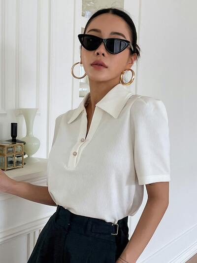 Elegancka, swobodna, letnia, jednokolorowa, plisowana, dopasowana bluzka damska z krótkim rękawem-49%
