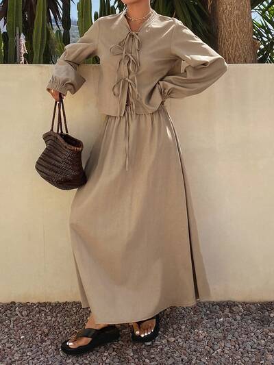 2-częściowy damski swobodny zestaw wakacyjny - luźna, jednolita koszula z okrągłym dekoltem i krótkim rękawem oraz długa plisowana spódnica, len wiosenno-letni-65%