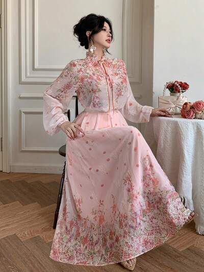 Wiosenno-letni komplet: bluzka z wiązaniem przy szyi i spódnica w kształcie litery A z drobnymi kwiatowymi motywami, elegancki na Walentynki, wesele, imprezę, formalną okazję, modny, dopasowany krój-27%