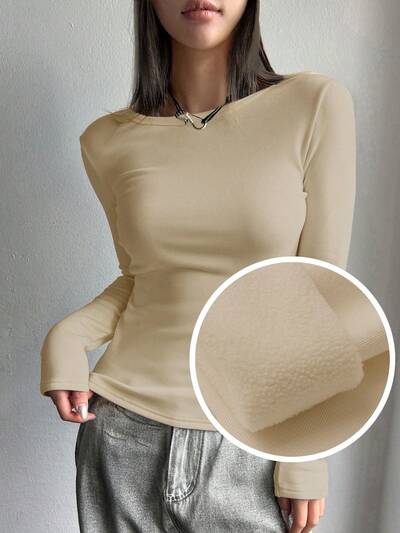 Damska koszulka termiczna z długim rękawem w jednolitym kolorze, z podszewką termiczną-49%