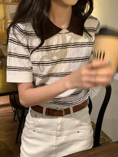 Damski wiosenny sweter polo w paski z żakardową dzianiną w kontrastowym kolorze-63%