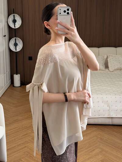Damski, cekinowy, patchworkowy, wycięty narzut z kokardką, elegancki top imprezowy na wiosnę/jesień