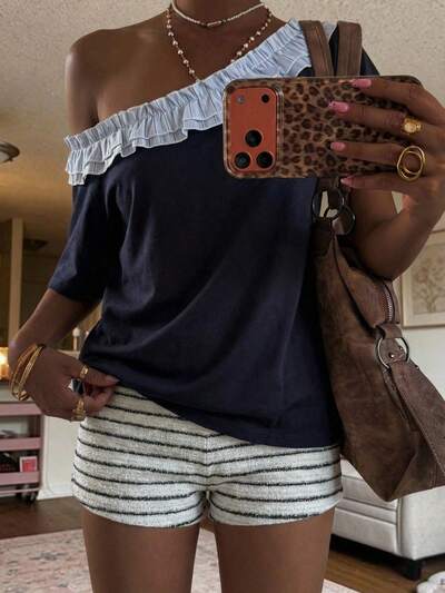 Damska, swobodna koszulka z krótkim rękawem i asymetrycznym wycięciem na ramionach, z falbanką, na lato