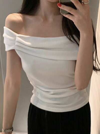 Letnia, swobodna, minimalistyczna, dojazdowa do pracy, elegancka, odsłaniająca ramiona, marszczona, dopasowana, krótka koszulka damska z krótkim rękawem