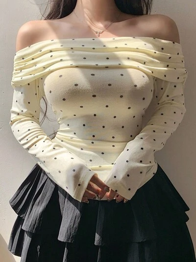 Dopasowana, seksowna koszulka z odkrytymi ramionami i długim rękawem w groszki i kremowo-żółtą bazę dla kobiet, odpowiednia na wiosnę, lato, jesień i jesień.