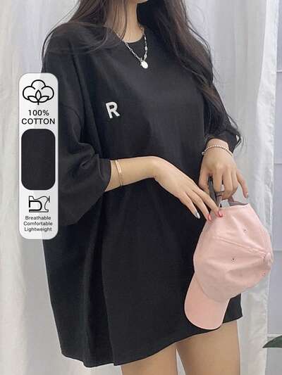 Luźny, minimalistyczny T-shirt z nadrukiem w litery, luźny krój, wysokiej jakości, dla kobiet, w dużym rozmiarze