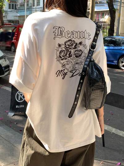 Damska koszulka z krótkim rękawem i okrągłym dekoltem, z nadrukiem kwiatowym i literami, uniwersalna, codzienna, z krótkim rękawem, z nadrukiem, damska, oversize