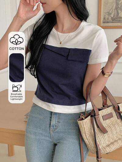 Damska letnia koszulka 2 w 1 z okrągłym dekoltem i krótkim rękawem w kontrastowym kolorze, z łączeniem splotów i luźnym krojem
