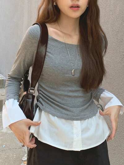 Damska koszulka 2 w 1 z długim rękawem w jednolitym kolorze, jesienna odzież damska