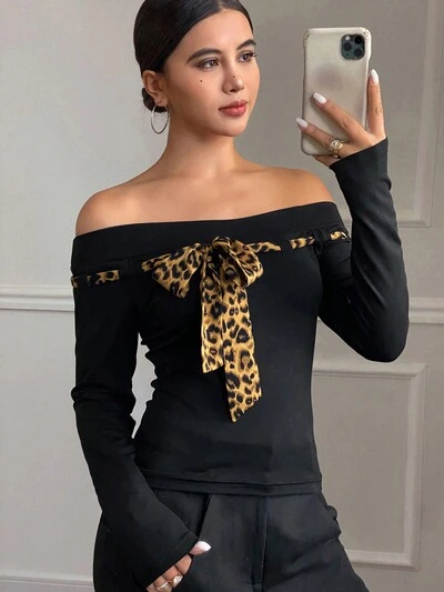 Koszulka damska z nadrukiem w panterkę, z odkrytymi ramionami i długim rękawem, dopasowana do sylwetki, z nadrukiem w panterkę, jesienne ubrania, urocze bluzki