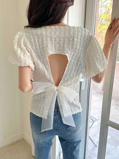 Damska koszulka z kokardą z odkrytym tyłem i wycięciem na plecach, teksturowana tkanina, odpowiednia na wiosnę/lato, urocze topy na Walentynki
