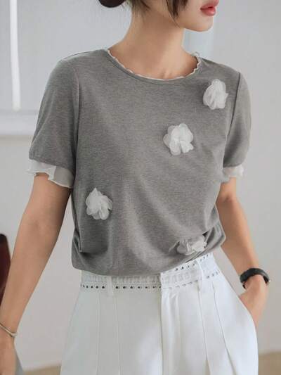 Damska letnia, swobodna, kontrastowa, siatkowa, patchworkowa, 3D, kwiatowa, dekoracyjna koszulka z krótkim rękawem, do pracy i na święta