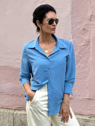 Koszula damska luźna z długim rękawem w kolorze niebieskim, jesień