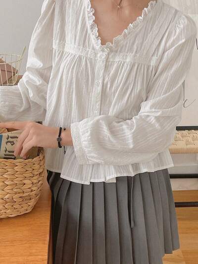 Bluzka z koronki w kwiaty, patchworku, dekoltu w serek, falbanki, z długim rękawem, na wakacje-65%