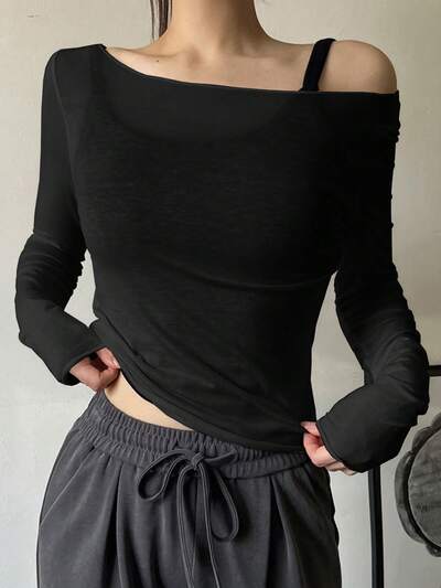 Nowa, jesienna, dopasowana koszulka damska z odkrytymi ramionami, przezroczysta, bluzka z odkrytymi ramionami, długi rękaw, jesienne ubrania damskie-70%