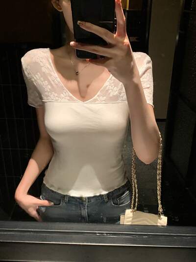 Damska koronkowa, patchworkowa, elegancka koszulka z krótkim rękawem, letnia