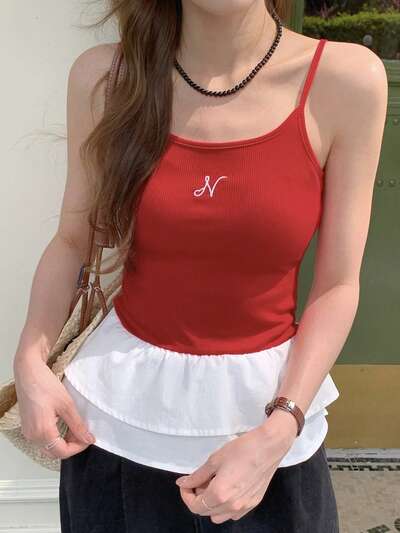 Damska letnia czerwona słodka dziewczęca swobodna kontrastowa kolorowa falbana dopasowana bluzka z ramiączkami-55%