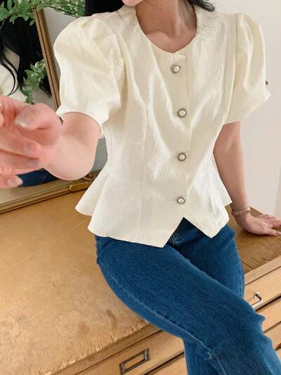 Koszula damska z teksturą, okrągłym dekoltem i krótkim rękawem, dopasowana, w kolorze białym, letnia