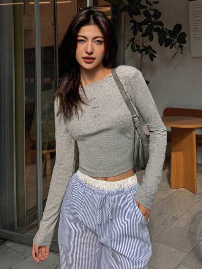Wiosenno-letnia, swobodna, jednokolorowa, damska koszulka z okrągłym dekoltem i długim rękawem, z kokardą i wąską talią, jesienne, krótkie bluzki damskie