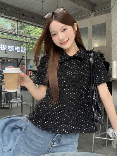 Damska koszula polo w koreańskim stylu z krótkim rękawem i kołnierzykiem w groszki-39%
