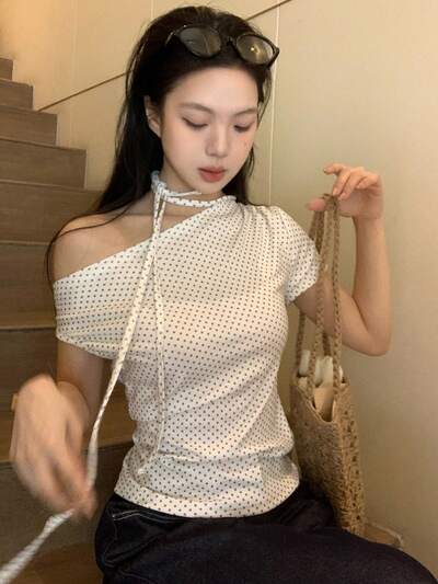 Damska koszulka z krótkim rękawem w groszki, z wiązaniem na ramionach, w stylu koreańskim, wiosna/lato-41%