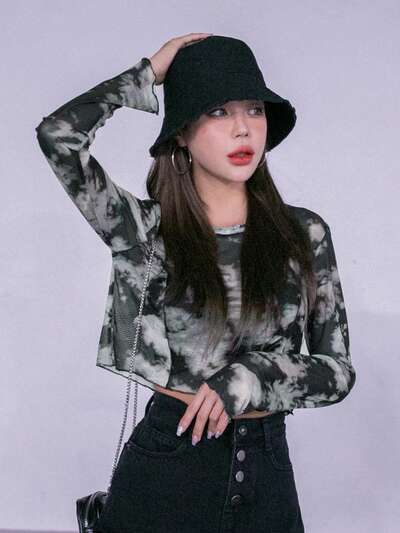 Top z siateczki tie-dye bez stanika, na co dzień, festiwalowy, z długim rękawem, jesienne ubrania damskie, krótkie topy damskie