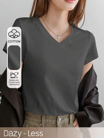 Damska letnia koszulka z krótkim rękawem i dekoltem w serek w jednolitym kolorze, w stylu vintage, biznesowa, casualowa, do pracy-25%