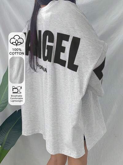 Damska letnia, casualowa koszulka z nadrukiem liter, okrągłym dekoltem i rękawami typu nietoperz, jesienna koszulka z grafiką