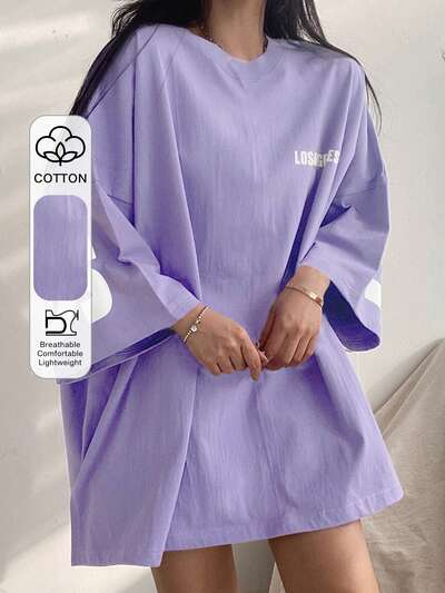 Damska letnia luźna koszulka z okrągłym dekoltem, opadającymi ramionami i nadrukiem liter, oversize'owa koszulka
