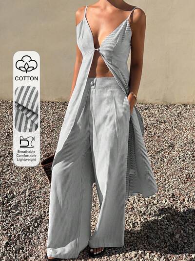 Zestaw w paski z koszulką i szerokimi spodniami, swobodny strój na wakacje dla kobiet-47%