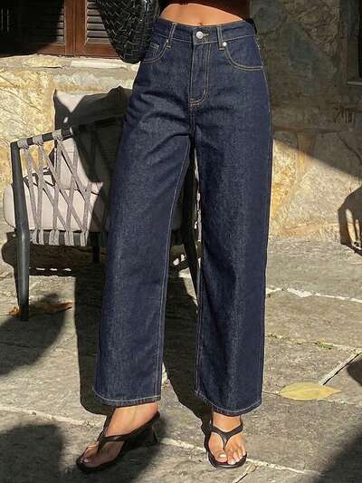 Damskie jeansy z regularnym stanem i pionowym rozcięciem, casualowe, z nogawkami w kształcie beczki, Y2k