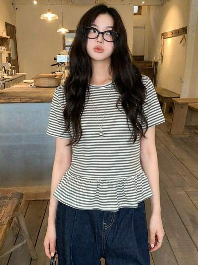 Damska luźna koszulka w paski z długim rękawem i falbaną u dołu, minimalistyczny design na lato
