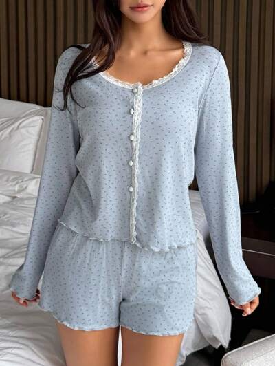 3-częściowy zestaw piżamowy dla kobiet w jednolitym kolorze, top z ozdobnymi guzikami i szortami w drobne kwiatki, ubrania na jesień i zimę