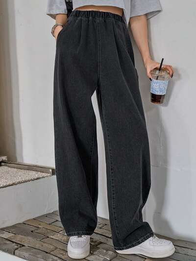 Damskie jeansy z elastyczną talią i kieszeniami, luźne, sprane, w stylu koreańskim