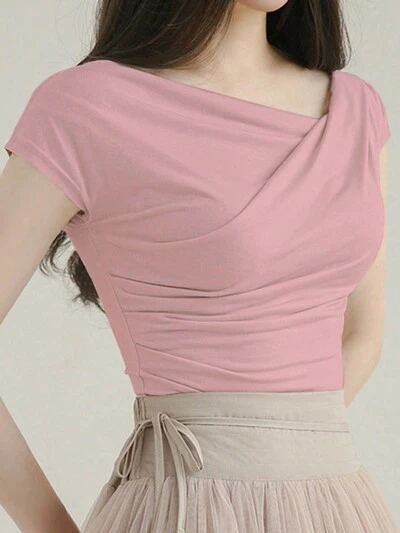 Jednolity kolor Asymetryczny Kołnierz Pomarszczona Szczupły Krótki Rękaw Koszulka Na lato-49%