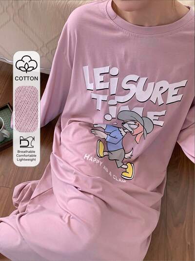 Dazy Plus Koszula nocna damska w dużym rozmiarze z nadrukiem w kreskówkowym stylu, luźna, z okrągłym dekoltem i długimi rękawami, wygodna sukienka domowa na wiosnę i jesień