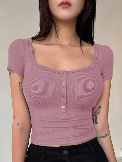 Damska letnia, swobodna, prążkowana, zapinana na guziki, półotwarta koszulka, obcisła koszulka z krótkim rękawem i dekoltem w kształcie serca-43%