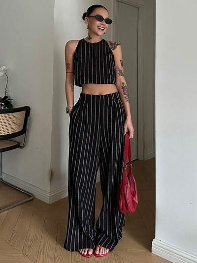 2 sztuki damskiego letniego swobodnego pasiastego topu i spodni-44%