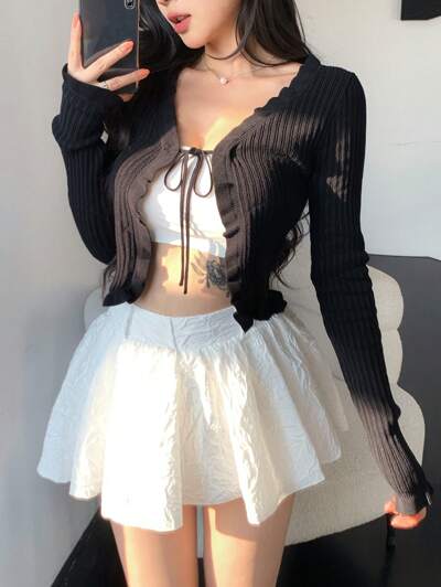 Damski krótki kardigan z falbanką i wiązaniem na sznurku, jesień, ubrania damskie-44%